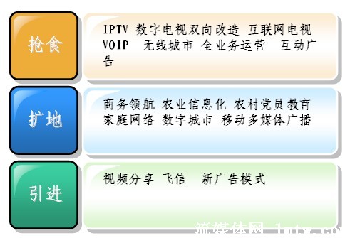 從廣義上講,廣電、電信、互聯(lián)網(wǎng)都屬于信息行業(yè),現(xiàn)在都面臨著自己在增長中遇到的問題,也就是滯漲。滯漲逼迫大家必須去轉(zhuǎn)型,轉(zhuǎn)型現(xiàn)在有三種方式,一個是搶,一個是擴,一個是引進。從最近會議上來看,目前大家對搶食比較感興趣,畢竟有現(xiàn)成的一碗紅燒肉已經(jīng)做好了,對后面兩個,相對來說談得還比較少,因為后面兩個,需要引入一些創(chuàng)新的技術,引入創(chuàng)新的思維。