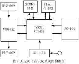 此語音識別系統(tǒng)的目的讓機(jī)器人能聽懂我們所發(fā)出的簡單的命令,首先由TLC320AD50C采集計算機(jī)聲卡的語音,經(jīng)過轉(zhuǎn)換后送給TMS320VC5402, TMS320VC5402完成語音信號處理,即識別出所發(fā)出的語音,然后把結(jié)果送給AT89S52顯示,同時通過串行通訊送給機(jī)器人(PC-104),以使機(jī)器人能夠控制自己的行動。其結(jié)構(gòu)框圖如圖2所示。