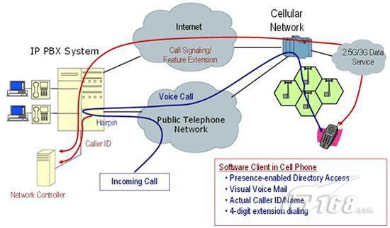 Sprint-Nextel最近推出了一種運用Femtocells技術、類似cFMC的解決方案,稱為Airave。按照這個方案,用戶把蜂窩通信網(wǎng)絡的一個小型基站同基地的寬帶互聯(lián)網(wǎng)連接在一起。如圖1所示,這兩種方案都是利用寬帶互聯(lián)網(wǎng)和蜂窩通信網(wǎng)絡其中之一實現(xiàn)Voip,不同的區(qū)別只是本地的無線連接是運用Wi-Fi技術還是蜂窩通信網(wǎng)絡。對企業(yè)用戶而言,主要缺點是,這兩種實現(xiàn)方式提供的都是由用戶主導的單一語音服務,而沒有面向企業(yè)PBX或移動UC系統(tǒng)的接口。