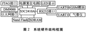 監(jiān)控系統(tǒng)控制器的核心CPU選用基于ARM920T內(nèi)核的16/32位RISC處理器 S3C2410A。該處理器功能強、性價比高、功耗低,提供了一套較完整的通用外圍設(shè)備接口,帶MMU(內(nèi)存管理單元),可支持Linux、μC/OS- II、WindowsCE等多種操作系統(tǒng)的移植。系統(tǒng)硬件結(jié)構(gòu)框圖如圖2所示。