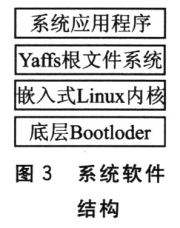 整個系統(tǒng)軟件結(jié)構(gòu)從下到上大體可分為3個層次,如圖3所示:底層的Bootloder、嵌入式Linux內(nèi)核以及系統(tǒng)應(yīng)用程序。