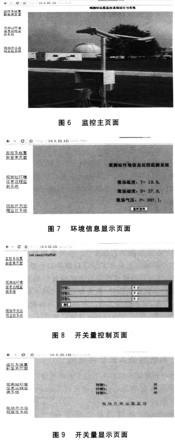 該監(jiān)控主頁面左側(cè)顯示有3個模塊:重新登陸頁面;觀測站遠程環(huán)境信息檢測系統(tǒng),能方便實時地查詢現(xiàn)場的環(huán)境狀態(tài),如圖7所示;現(xiàn)場開關(guān)的遠程監(jiān)控系統(tǒng),可以控制3個開關(guān)量的開關(guān),如圖8所示,并能查詢它們當(dāng)前狀態(tài),設(shè)置監(jiān)控頁面每隔15