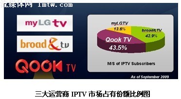 2008年11月份,KT的IPTV服務(wù)開(kāi)始落地,不僅包括實(shí)時(shí)直播頻道,并且全力打造IPTV超高速互聯(lián)網(wǎng)品牌QOOKTV,截至2009年9月份QOOKTV用戶已經(jīng)超過(guò)八十萬(wàn)戶,目前為韓國(guó)95%的人群提供服務(wù)。