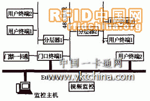 系統(tǒng)采用了兩套獨立的網(wǎng)絡系統(tǒng),第一套是基于485總線半雙工網(wǎng)絡系統(tǒng),第二套是基于以太網(wǎng)的局域網(wǎng)。基于485總線半雙工網(wǎng)絡系統(tǒng)用以連接門口終端、分層器和用戶終端,這主要是從成本上考慮。由于這三部分交換的信息比較少,數(shù)據(jù)交換的速度要求也不是很高而且實現(xiàn)比較簡單,故采用了這種網(wǎng)絡系統(tǒng)。