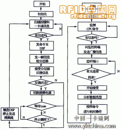 對于底層軟件,主要是門口終端的控制軟件,其工作流程如圖5所示。門口終端上電后,先進行初始化工作,然后開始掃描按鍵和一卡通信息,當確認有變化時,微處理器CPU l先給分層器發(fā)送一幀信息,并且監(jiān)聽分層器的反饋信息,同時啟動DSP通過網(wǎng)絡端口發(fā)送廣播消息給監(jiān)控終端,以便啟動監(jiān)控終端的接受線程接受視頻流和訪問信息或一卡通信息。當時間超過l min或終止鍵按下時,雙方終止通信,門口終端與監(jiān)控終端之間由CPU1觸發(fā)DSP中斷,使其停止發(fā)送視頻流數(shù)據(jù)。