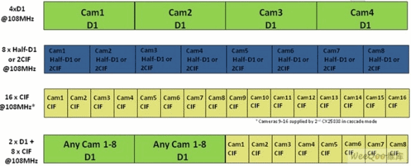 CX25838為監(jiān)控DVR設計人員提供機會,通過提供幀交錯數據實現編解碼器效率最大化,而不采用昂貴的FPGA或可編程邏輯。它還通過提供各種分辨率和幀速率,在一系列產品*享系統(tǒng)架構,提供規(guī)模優(yōu)勢的能力。例如,低成本DVR可采用一個編解碼器以全幀速率壓縮16個CIF分辨率通道,這可通過一條8位總線實現。其他解決方案可能需要每個編解碼器以全幀速率壓縮4個D1分辨率通道。還有些可能需要降低幀速率的D1