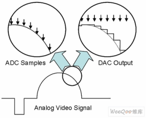由攝像機或其他設(shè)備捕獲的模擬視頻信號通過模/數(shù)轉(zhuǎn)換器(ADC)進行數(shù)字化處理,它在每個時鐘邊沿即時記錄數(shù)據(jù)(圖2)。模擬信號連續(xù)變化,而轉(zhuǎn)換成數(shù)字信號時則是定時采樣。經(jīng)過數(shù)字處理和傳輸后,數(shù)字信號通過數(shù)/模轉(zhuǎn)換器(DAC)轉(zhuǎn)變成模擬信號。DAC的輸出如圖2的右上角所示,箭頭代表時鐘信號。
