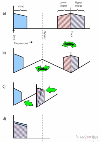 從圖5可以看出重建濾波器的作用,利用參考書中提供的定理可以很容易理解頻譜混疊。通常,在頻域,頻率和放大倍數(shù)都采用對數(shù)刻度,重建濾波器的頻響特性表現(xiàn)為平滑曲線。然而,為了說明邊帶重疊的位置,我們用線性坐標(biāo)表示頻率和放大倍數(shù)。為了表示低通濾波器在同樣刻度坐標(biāo)下的衰減特性,從濾波器頻響曲線可以看出:對于有用的視頻信號衰減很少,對于鏡像頻率衰減較大。圖5b和5c顯示了混疊效應(yīng),但是應(yīng)該注意到,與圖3d相比,圖5d中的鏡像頻率被顯著衰減。