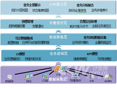 業(yè)務(wù)建模層: 是整個監(jiān)控系統(tǒng)的核心,是將業(yè)務(wù)進(jìn)行有形化管理、量化衡量的高效手段。該業(yè)務(wù)建模層中涵蓋了幾乎所有的BOSS管理資源要素,包括業(yè)務(wù)、應(yīng)用、服務(wù)及其他平臺類資源,這些信息都建立并實(shí)時更新于企業(yè)集中建設(shè)的符合ITIL標(biāo)準(zhǔn)的CMDB(配置資源數(shù)據(jù)庫,其中每一子項(xiàng)便是一個CI配置資源項(xiàng))中。基于CMDB中動態(tài)調(diào)整的實(shí)時CI項(xiàng)和相互關(guān)系,關(guān)聯(lián)上能夠反映業(yè)務(wù)當(dāng)前狀況的KPI指標(biāo),以結(jié)構(gòu)化的模型框架為指導(dǎo),建立完整的業(yè)務(wù)CI/KPI指標(biāo)體系,繪制出以業(yè)務(wù)為中心的BOSS系統(tǒng)視圖,全面展現(xiàn)其健康度和可用性。