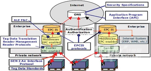 EPCglobal提出了Auto-ID系統(tǒng)的五大技術組成,分別是EPC(電子產(chǎn)品碼)標簽、RFID標簽閱讀器、ALE中間件實現(xiàn)信息的過濾和采集、EPCIS信息服務系統(tǒng),以及信息發(fā)現(xiàn)服務(包括ONS和PML)。由于從一開始就讓世界各大洲的從業(yè)人員充分參與,EPCGlobal標準(架構圖如下)得到了較廣泛認同,這里不再對其標準體系架構贅述。