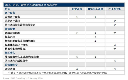 DMG的基準調(diào)研顯示IT有自己的優(yōu)先級:IT2010年的首要目標是滿足商業(yè)客戶的需求并使企業(yè)的技術(shù)和應用軟件運行在最佳狀態(tài)。這表明IT企業(yè)是帶著強烈的支持企業(yè)客戶目標和目的的意愿步入2010年的。但令人失望的是IT企業(yè)并沒有努力去了解他們客戶的目標。這種目標上的不一致是導致IT和聯(lián)絡(luò)中心之間缺乏信任的主要原因。