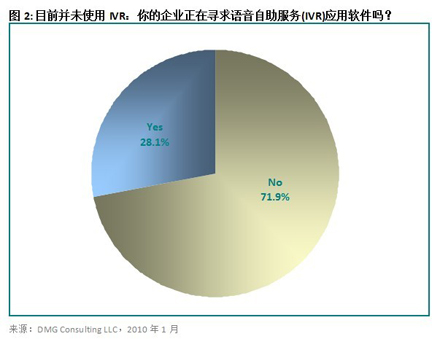 28.1%目前還沒有使用IVR系統(tǒng)的公司正在積極尋求語音自助服務解決方案來幫助自己達成目標,這一數(shù)字高得頗讓人驚訝。見圖2。經(jīng)濟衰退促使那些曾經(jīng)對使用自助服務技術(shù)猶豫不決的企業(yè)下定決心投資購買此類解決方案。一個具有正確規(guī)劃、設(shè)計和投放過程的IVR系統(tǒng)能夠?qū)⑷斯ご硖幚淼碾娫捔拷档?0%到90% (長期來說),具體數(shù)字有賴于聯(lián)絡(luò)中心的目的以及編入解決方案內(nèi)部的任務。IVR用戶的增長勢頭有望在經(jīng)濟形勢好轉(zhuǎn)之后仍然延續(xù)下去。一個經(jīng)過良好設(shè)計并成功實施的IVR方案所帶來的利益和節(jié)約的成本是即便最不情愿使用它的經(jīng)理都不得不承認的。