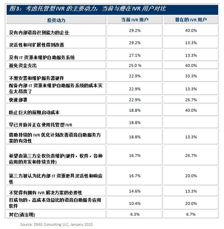 圖3顯示了現(xiàn)有和潛在的語音自助服務用戶尋求托管型IVR的主要動力來源。潛在客戶認真考慮托管型IVR解決方案的兩個很明顯的原因是避免大的資金開銷和最小化啟動成本,在經(jīng)濟不景氣時這樣的做法并不令人意外。另外還有個原因是希望一邊使用該方案一邊積累經(jīng)驗和知識。