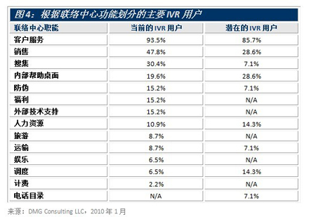圖4根據(jù)職能對現(xiàn)有和潛在的主要IVR用戶進行了區(qū)分。客戶服務和銷售聯(lián)絡(luò)中心是最上層的IVR用戶,分別占現(xiàn)有用戶量的93.5%和47.8%,占潛在用戶量的85.7%和28.6%。