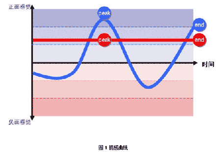 諾貝爾獎得主心理學家Daniel Kahneman發(fā)現人們在一次體驗中只會記住兩件事:峰值感受(流程中最好或最差的一點)以及終了感受。我運用“峰值——終了規(guī)則”將每個子流程上的情感感受按照自然時間順序連成一根“情感”曲線,如圖1所示。
