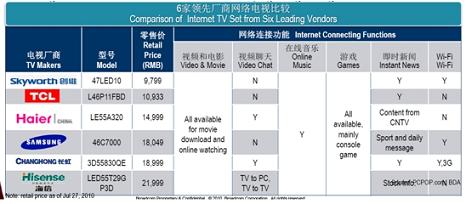 “相比國外廠商認(rèn)為規(guī)則尚不明確,持保守態(tài)度,國內(nèi)的電視機(jī)廠商比國外同行顯得更熱衷網(wǎng)絡(luò)電視。”Michael表示,“長虹、TCL、海信、康佳及創(chuàng)維等廠商都在2009年推出了各自的網(wǎng)絡(luò)電視系列,網(wǎng)絡(luò)電視被國內(nèi)電視廠商視為開拓藍(lán)海市場,獲取更多利用的機(jī)會(huì)。尤其在三網(wǎng)融合的背景下,網(wǎng)絡(luò)電視在中國被普遍認(rèn)為將有很大前景!
