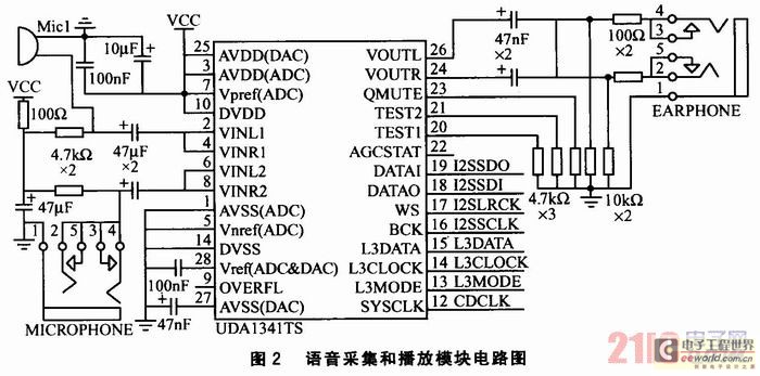 語音采集和播放模塊的作用是將音頻模擬信號轉換為數(shù)字信號,并對信號進行PCM編碼。其電路如圖2所示。采用Philips公司的UDA1341 TS型立體聲音頻CODEC進行音頻編解碼。該芯片提供2個麥克風輸入,可實現(xiàn)單端輸入、差分輸入等靈活配置,并設置了可編程增益放大器和自動增益控制器,可保證高質量的音頻獲;同時,還集成了聽筒和喇叭輸出的驅動器,喇叭音量可以通過編程調整。S3C2440A-40微處理器與UDA1341TS編解碼器通過I2S總線直接相連,并采用DMA發(fā)送/接收方式,完成系統(tǒng)的錄音和放音。