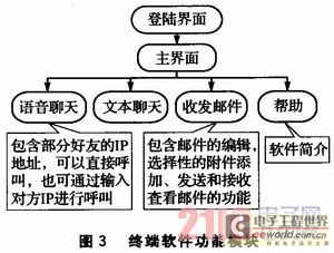 用戶打開終端軟件,可以根據(jù)自己的需要選擇語音聊天、文本聊天或者收發(fā)郵件。進行語音聊天前,用戶可以直接在好友欄中選擇聊天對象,也可直接輸入對方的IP進行連接。語音聊天的過程是:說話方,麥克風采集模擬語音信號→語音芯片采集量化編碼→嵌入式系統(tǒng)對信號進行壓縮編碼→RTP格式打包→UDP格式打包→IP格式打包→Internet網絡傳輸;收聽方,接收語音數(shù)據(jù)→去IP/UDP/RTP包頭→嵌入式系統(tǒng)對信號解碼→語音芯片將數(shù)字語音信號轉為模擬信號→揚聲器播放。