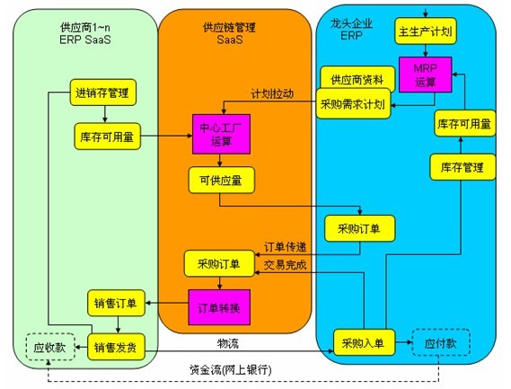 在線需求計(jì)劃管理。當(dāng)龍頭完成企業(yè)內(nèi)部的MRP運(yùn)算后,便輸出“采購(gòu)需求計(jì)劃”;該計(jì)劃作為供應(yīng)鏈管理平臺(tái),中心工廠(或稱虛擬企業(yè))運(yùn)算的輸入,此刻供應(yīng)鏈管理平臺(tái)可以動(dòng)態(tài)地挖掘供應(yīng)商的(ERP)的“庫(kù)存可用量”,并計(jì)算出“可供應(yīng)量”,該數(shù)據(jù)可提供給龍頭企業(yè)編制“采購(gòu)訂單”。
