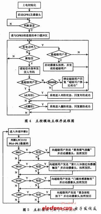 在主控模塊主程序中系統(tǒng)一直在檢測(cè)是否有來(lái)電和新短信信息,當(dāng)有來(lái)電時(shí)系統(tǒng)會(huì)自動(dòng)掛斷電話,然后判斷是不是超級(jí)用戶:是,啟動(dòng)攝像頭拍照,并發(fā)送給超級(jí)用戶;不是,系統(tǒng)將不理睬,繼續(xù)檢測(cè)。當(dāng)是短消息時(shí),判斷是否是超級(jí)用戶:不是,判斷短信內(nèi)容是“888888 ”否,是則系統(tǒng)綁定該號(hào)碼為超級(jí)用戶,并回復(fù)“超級(jí)用戶綁定成功”;是,判斷短信內(nèi)容是否是“bf”或“cf”,是“bf”系統(tǒng)進(jìn)入布防狀態(tài),并回復(fù)“布防成功”,是“cf”系統(tǒng)撤防,回復(fù)“撤防成功”。