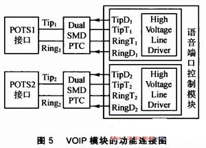 VOIP模塊的功能連接圖如圖5所示。Dual SMD PTC叫做雙重?zé)崦綦娮瑁蓪?duì)過(guò)熱和過(guò)流雙重作用導(dǎo)致的電路故障進(jìn)行保護(hù);Tip and Ring(正極線和負(fù)極線)表示組成電話配線電路的兩條電線,Tip是正極線的別稱(chēng),Ring是負(fù)極電線的別稱(chēng)。
