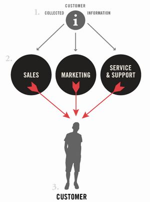傳統(tǒng)CRM是將公司搜集到的消費(fèi)者有關(guān)信息輸入到CRM系統(tǒng)中,通過(guò)銷售、市場(chǎng)推廣以及產(chǎn)品服務(wù)等措施,借此有可能獲得更多的潛在目標(biāo)消費(fèi)者。