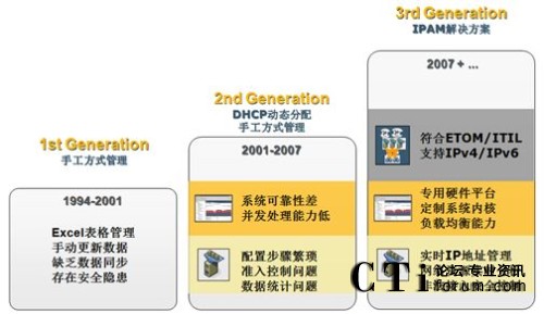 新一代網(wǎng)絡(luò)核心服務(wù)自動(dòng)化管理支撐平臺(tái)能自動(dòng)、有效地管理訪問網(wǎng)絡(luò)的IP/MAC 資源,實(shí)時(shí)提供更新數(shù)據(jù),控制未授權(quán)IP/MAC地址訪問網(wǎng)絡(luò),從而提高內(nèi)部網(wǎng)絡(luò)的可管理性和安全性。下圖是網(wǎng)絡(luò)核心服務(wù)解決方案的所經(jīng)歷的發(fā)展階段: