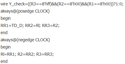 在硬件描述語(yǔ)言中,完成上述過(guò)程還是比較簡(jiǎn)單的。例如檢測(cè)電路,只要描述一個(gè)移位寄存器就可以了,具體代碼如下: