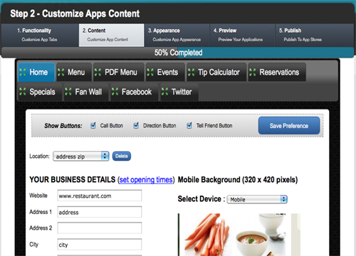 Bizness Apps采用可視化操作界面,用戶只需要點(diǎn)擊設(shè)置相關(guān)選項(xiàng)就能完成應(yīng)用的開發(fā)工作。因此,Bizness Apps很適合缺少專業(yè)技術(shù)人員的小企業(yè)開發(fā)本行業(yè)應(yīng)用。利用Bizness Apps開發(fā)行業(yè)應(yīng)用只需五步。首先,開發(fā)者選擇對應(yīng)的行業(yè)后,需要為應(yīng)用添加功能組件。第二步,為訂制好的功能組件添加內(nèi)容。第三步,為應(yīng)用選定外觀的設(shè)計(jì)方案。第四步,預(yù)覽經(jīng)過定制后的應(yīng)用。最后,完成付費(fèi)后即可發(fā)布你的應(yīng)用。