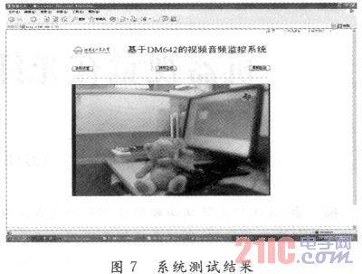 在集成開發(fā)環(huán)境CCS(C6000)下,加載相關驅(qū)動程序,對本系統(tǒng)進行了測試。CCD攝像頭為標準PAL制式,圖像采集的幀頻為25幀/s,圖像的分辨率為720×576像素。測試結果如圖7所示。測試結果表明,網(wǎng)絡連接正常,用戶在PC端可通過瀏覽器訪問系統(tǒng),成功實現(xiàn)遠程監(jiān)控。