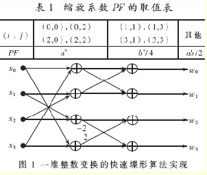 ·2q,PF稱為縮放系數(shù),根據(jù)元素在陣列塊中的不同位置,其取值如表1所示,Qstep為量化步長,由0至51共52個(gè)量化參數(shù)QP決定,QP增加1,Qstep增加12.5%;q=15+QP/6,QP/6取整數(shù);對(duì)于幀內(nèi)宏塊f取2q/3,幀間宏塊f取2q/6。需要指出的是,MF的值可根據(jù)PF和QP的取值經(jīng)簡單計(jì)算得到,并可形成表格,通過查表方式便可實(shí)現(xiàn)硬件運(yùn)算,并有效地提高了運(yùn)算速度。