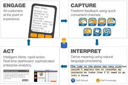該應(yīng)用軟件能夠捕捉所有聯(lián)絡(luò)渠道上任何形式的客戶反饋;包括文本,郵件,電話,網(wǎng)絡(luò)或者手寫(xiě)的。然后系統(tǒng)利用先進(jìn)的模式識(shí)別規(guī)則對(duì)客戶反饋進(jìn)行破譯并采取適當(dāng)?shù)男袆?dòng);直接響應(yīng)客戶,將信息轉(zhuǎn)發(fā)給其他更適合響應(yīng)的人并創(chuàng)建實(shí)時(shí)管理信息。
