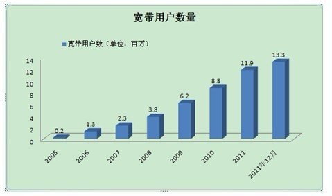 去年進行的3G/BWA牌照拍賣有望成為一個催化劑,將寬帶接入擴展到印度最偏遠的地方。印度電信市場正在經(jīng)歷“信息革命”。為了促進寬帶的普及,政府已經(jīng)公布并實施了多項政策(見方框3)。得益于這些政策的實施,寬帶用戶數(shù)從2005年的18萬增加到2011年3月的1187萬,2011年底達到1330萬。
