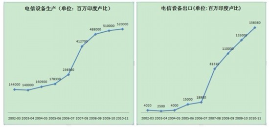 印度并不滿足于僅成為制造業(yè)中心,還計劃擴大出口。2006-2007年,印度電信設(shè)備出口總價值約為189.8億盧比,到2010-2011年,這一數(shù)字增加到1583.8億,增長了730%。