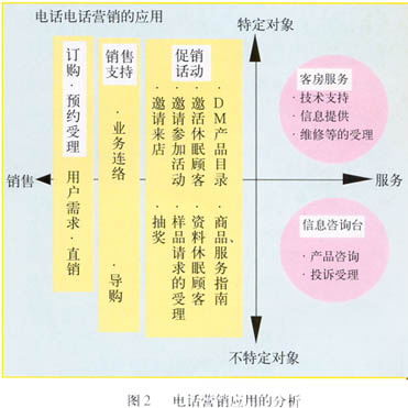 ——圖2表示以電話營(yíng)銷的目的及對(duì)象為軸分析電話營(yíng)銷的應(yīng)用。縱軸為對(duì)象,分為“特定”和“不特定”,橫軸為目的,分為“服務(wù)”和“銷售”。這樣右上區(qū)域=“特定對(duì)象X服務(wù)”,即為客戶服務(wù),右下區(qū)域=“不特定對(duì)象X服務(wù)”,對(duì)應(yīng)信息咨詢;左側(cè)為銷售。從對(duì)象來(lái)看,服務(wù)更偏重于“特定對(duì)象”。從目的來(lái)看,訂購(gòu)/預(yù)約受理是最直接的銷售行為,所以放在最左,銷售支持在中間,促銷活動(dòng)靠右。