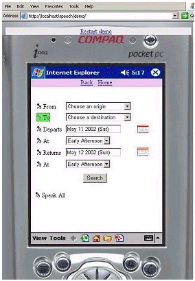 .NET Speech SDK目前為免費提供。其中包括設(shè)置Web應(yīng)用的語音輸入/輸出動作的工具、用于根據(jù)不同的應(yīng)用來限制終端用戶語言的語音語法編輯器、語音即時編輯器、語音調(diào)試工具以及嵌入到WWW瀏覽器(面向個人電腦的IE)中的試驗用插件等。微軟今后還將繼續(xù)強(qiáng)化其功能,在2003年公布正式版以前,準(zhǔn)備追加使用電話的語音識別功能、支持用于PDA的“Pocket Internet Explorer”的語音識別插件,以及在終端和服務(wù)器上負(fù)責(zé)語音處理的分散型語音識別功能等。上圖顯示了具有語音識別功能的面向Pocket PC的應(yīng)用的演示畫面。單擊左測的麥克風(fēng)形狀的圖標(biāo)后,就可以利用語音操作菜單。另外,.NET Speech SDK 1.0版只有英文版,供貨時間尚未確定的2.0版據(jù)稱將支持日語和其他語言。