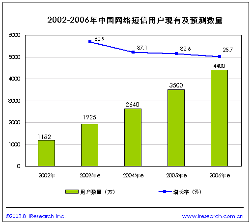 上海艾瑞市場(chǎng)咨詢有限公司是一家專注于網(wǎng)絡(luò)媒體、網(wǎng)絡(luò)營銷等網(wǎng)絡(luò)經(jīng)濟(jì)領(lǐng)域的專業(yè)市場(chǎng)調(diào)研機(jī)構(gòu)。公司近期發(fā)布《2003年中國網(wǎng)絡(luò)短信研究報(bào)告》,該報(bào)告中根據(jù)中國的網(wǎng)絡(luò)經(jīng)濟(jì)發(fā)展情況預(yù)測(cè):2003年中國網(wǎng)絡(luò)短信用戶將達(dá)到1925萬,2004年將達(dá)到2640萬。