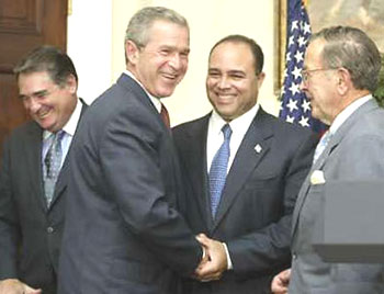 (圖為:布什和FCC主席邁克爾·鮑威爾握手)