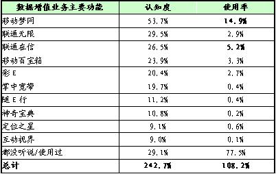 數(shù)據(jù)增值業(yè)務(wù)品牌認知度較高的是移動夢網(wǎng)、聯(lián)通無限等,而使用率很低