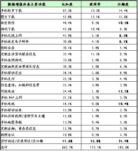 興趣度:手機鈴聲下載、可視電話、圖片下載、收發(fā)彩信、手機電視、定制生活資訊服務(wù)信息(新聞、天氣預報等)、游戲下載、手機無線上網(wǎng)等