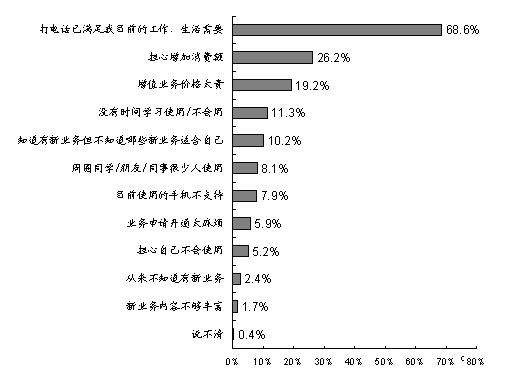 調(diào)查發(fā)現(xiàn),目前制約手機用戶使用更多數(shù)據(jù)增值業(yè)務(wù)的原因主要是:“打電話已經(jīng)滿足目前的工作/生活需要”(占68.6%)、“擔心增加消費額”(占26.2%)、“增值業(yè)務(wù)價格太貴” (占19.2%)、“沒有時間學習使用/不會用”(占11.3%)、“知道有新業(yè)務(wù)但不知道哪些新業(yè)務(wù)適合自己”(占10.2%)等。