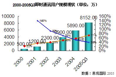 從1999年騰訊推出 OICQ 開始,短短幾年時間中,即時通信用戶數(shù)量迅速增長。在2000年至2004年期間,年增長率分別為140%、92%、70%和51%。根據(jù)易觀國際大樣本調(diào)研的結果,到2005第三季度中國即時通訊用戶數(shù)量增長到8,152萬,比去年增長38%。
