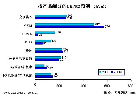 易觀國際預(yù)測2006年全國電信運營商的資本總開支為2053億(不包括 3G 資本開支),比2005年下降1%?偟目磥,運營商在