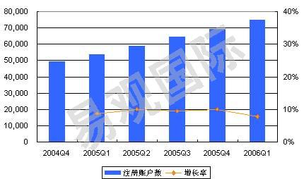 2006年第1季度中國(guó)即時(shí)通訊注冊(cè)賬戶規(guī)模達(dá)到7.4657億,相比2005年第4季度增長(zhǎng)7.8%,為5個(gè)季度來(lái)最低。