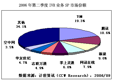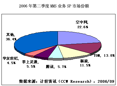 計世資訊(CCW Research)調(diào)研顯示。2006年第二季度,中國SMS業(yè)務(wù)市場規(guī)模達到118.3億元人民幣,其中SP收入12.1億元人民幣。TOM、騰訊和新浪排名前三位,分別占12.5%、9.6%和9.1%。其次為掌上靈通和空中網(wǎng),占8.6%和8.3%。