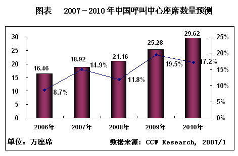計(jì)世資訊(CCW Research)的研究成果《2006-2007年中國(guó)呼叫中心市場(chǎng)研究報(bào)告》預(yù)計(jì),2007-2010年中國(guó)呼叫中心的產(chǎn)業(yè)投入規(guī)模平均年度復(fù)合增長(zhǎng)率將超過(guò)20%,預(yù)計(jì)2007年中國(guó)呼叫中心投入規(guī)模將達(dá)到337.19億元,同比增長(zhǎng)24.8%。由于2007、2009兩個(gè)年度中國(guó)呼叫中心將開始更換新的系統(tǒng)平臺(tái),并開拓遠(yuǎn)程座席市場(chǎng),因此2007年的呼叫中心座席規(guī)模增長(zhǎng)率高于2006年,2009年的呼叫中心座席規(guī)模增長(zhǎng)率高于2008年。預(yù)計(jì)2007年中國(guó)呼叫中心座席數(shù)量將達(dá)到18.92萬(wàn)個(gè),同比增長(zhǎng)14.9%;而2006年呼叫中心座席數(shù)量的同比增長(zhǎng)率僅僅是8.7%,可見2007年的增長(zhǎng)率比2006年的高出6.2個(gè)百分點(diǎn)。計(jì)世資訊(CCW Research)研究認(rèn)為,2007年成為中國(guó)呼叫中心產(chǎn)業(yè)發(fā)展的轉(zhuǎn)折點(diǎn),2007年中國(guó)開始進(jìn)入第二波呼叫中心建設(shè)高潮期。
