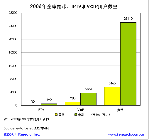 iResearch艾瑞市場(chǎng)咨詢根據(jù)eMarketer最新的數(shù)據(jù)發(fā)現(xiàn),寬帶上網(wǎng)環(huán)境為一些列的寬帶平臺(tái)應(yīng)用產(chǎn)品創(chuàng)造了良好的使用環(huán)境,各種服務(wù)同步發(fā)展起來。隨著全球?qū)拵в脩魯?shù)量的逐漸增加,全球IPTV和VoIP用戶也迅速成長。到2006年全球?qū)拵в脩暨_(dá)到2.511億人,VoIP和IPTV的全球用戶數(shù)量也分別達(dá)到了3780萬人和490萬人。