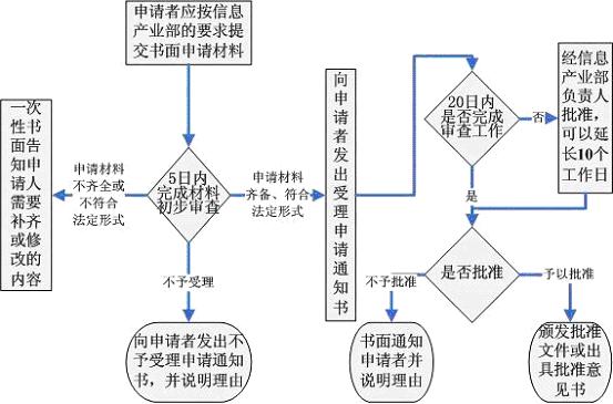 信息產(chǎn)業(yè)部或者省、自治區(qū)、直轄市通信管理局應(yīng)當(dāng)自發(fā)出受理申請通知書之日起20個工作日內(nèi)完成審查工作,作出批準(zhǔn)或不予批準(zhǔn)的決定。20個工作日內(nèi)不能做出決定的,經(jīng)信息產(chǎn)業(yè)部或者省、自治區(qū)、直轄市通信管理局負(fù)責(zé)人批準(zhǔn),可以延長10個工作日,并將延長期限的理由告知申請人。予以批準(zhǔn)的,出具正式批準(zhǔn)文件;不予批準(zhǔn)的,書面通知申請人并說明理由。