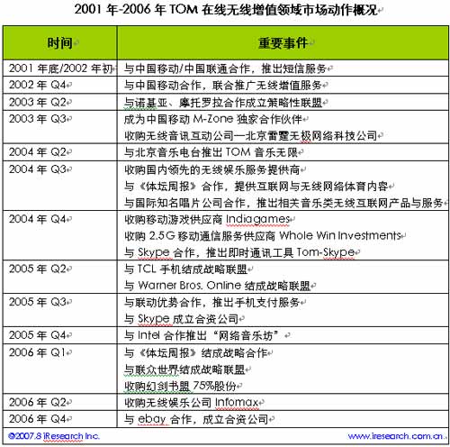 2000年中,TOM在線正式推出,這家一開始便以無線增值為特色的企業(yè)符合了當時中國互聯網市場的環(huán)境,那時無線增值業(yè)務如火如荼,第五媒體的概念呼之欲出。隨后,便開始了與各大無線媒體、傳統媒體等一系列的合作和收購,所涉及的領域涵蓋短信、無線音樂、手機游戲、手機支付、手機體育新聞、即時通訊等許多行業(yè),一個龐大的無線媒體帝國看似已經牢不可破。直到,2006年第四季度與ebay易趣合并,開始涉足電子商務。