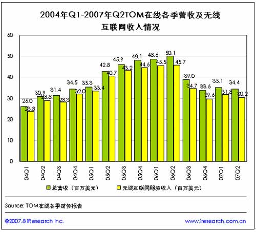 在2006年第二季度總營收以及無線互聯網服務收入分別達到歷史最高點(分別達到5010萬美元和4571萬美元)之后,TOM在線各季收入及無線互聯網收入呈逐季下滑趨勢,至2007年第二季度,TOM在線的總營收為3439萬美元,來自無線互聯網服務的收入為3024萬美元!